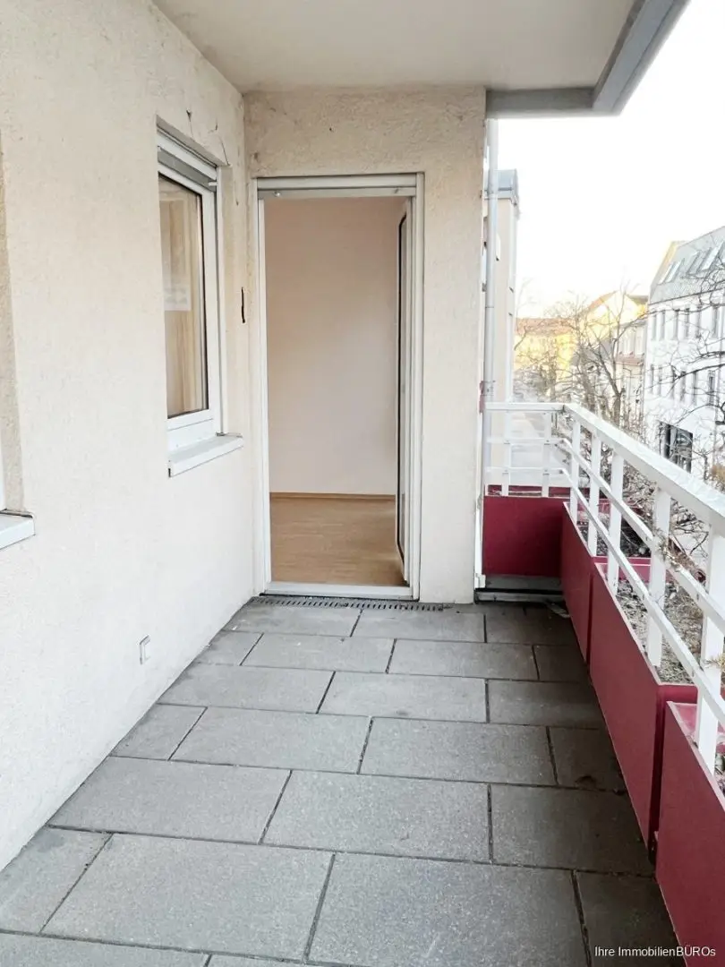 Der große nach Osten gerichtete Balkon ist vom Wohnzimmer aus zu begehen.