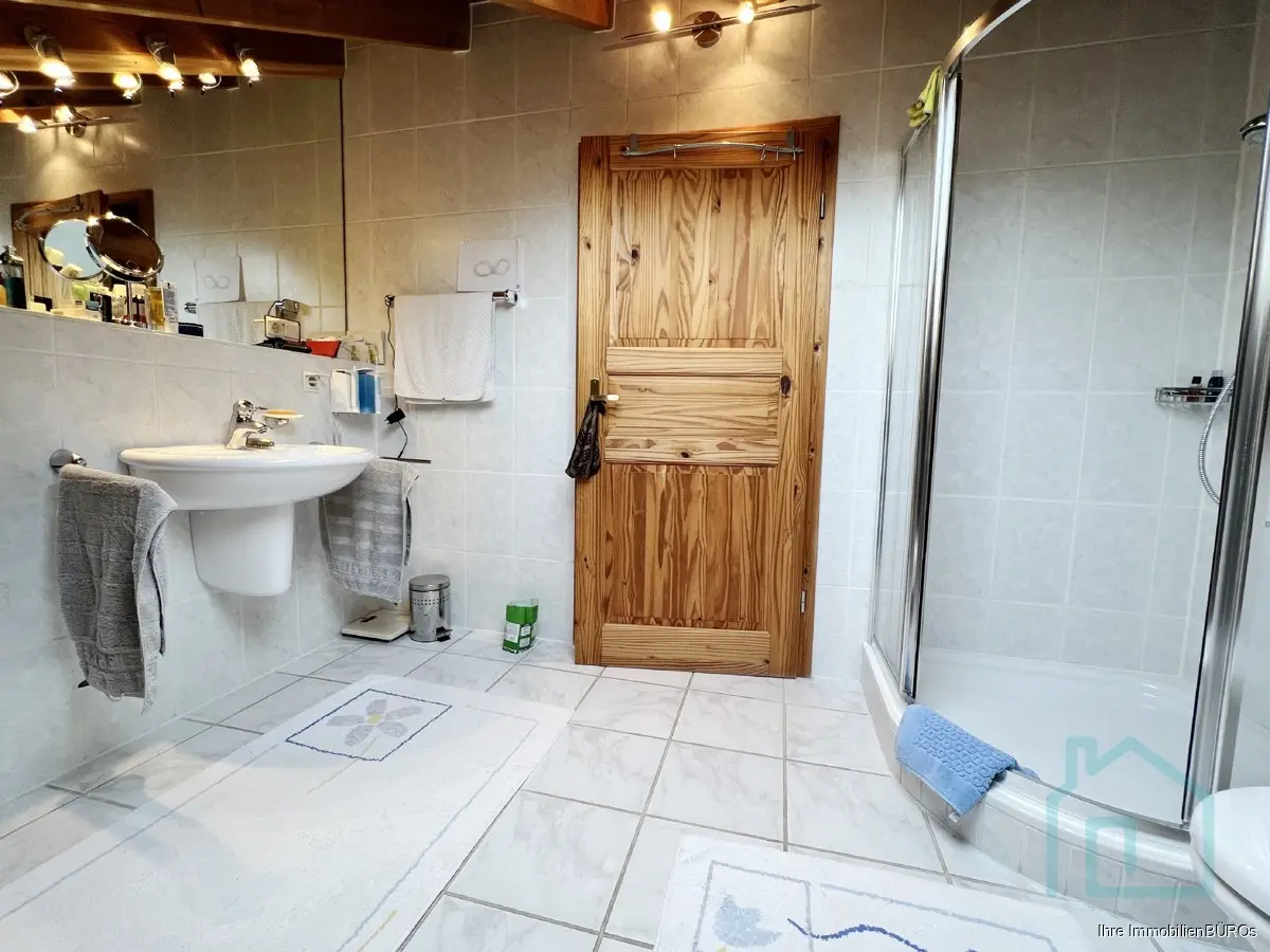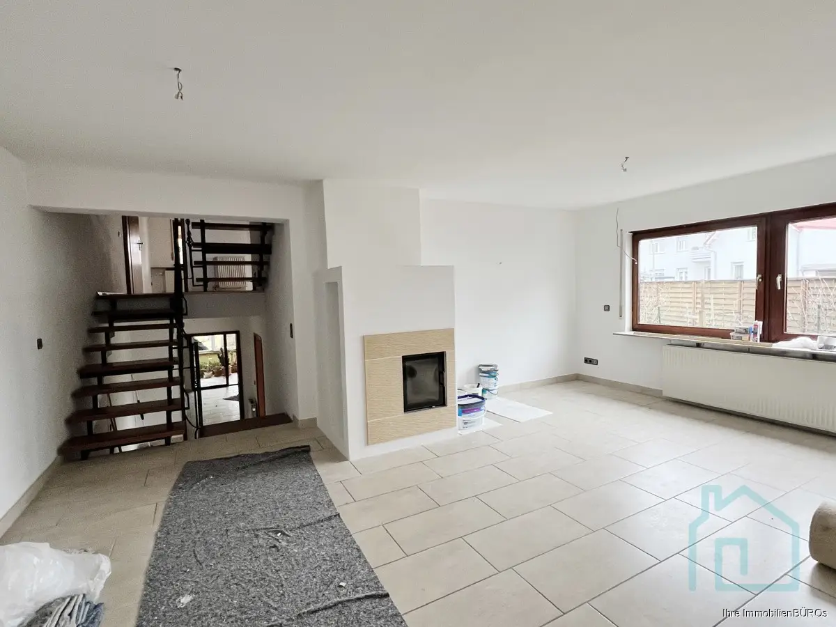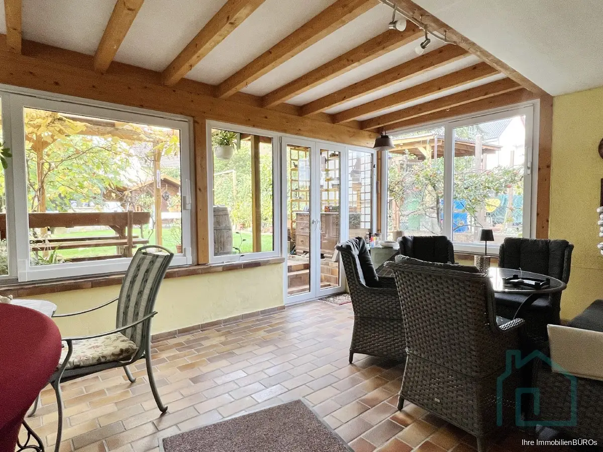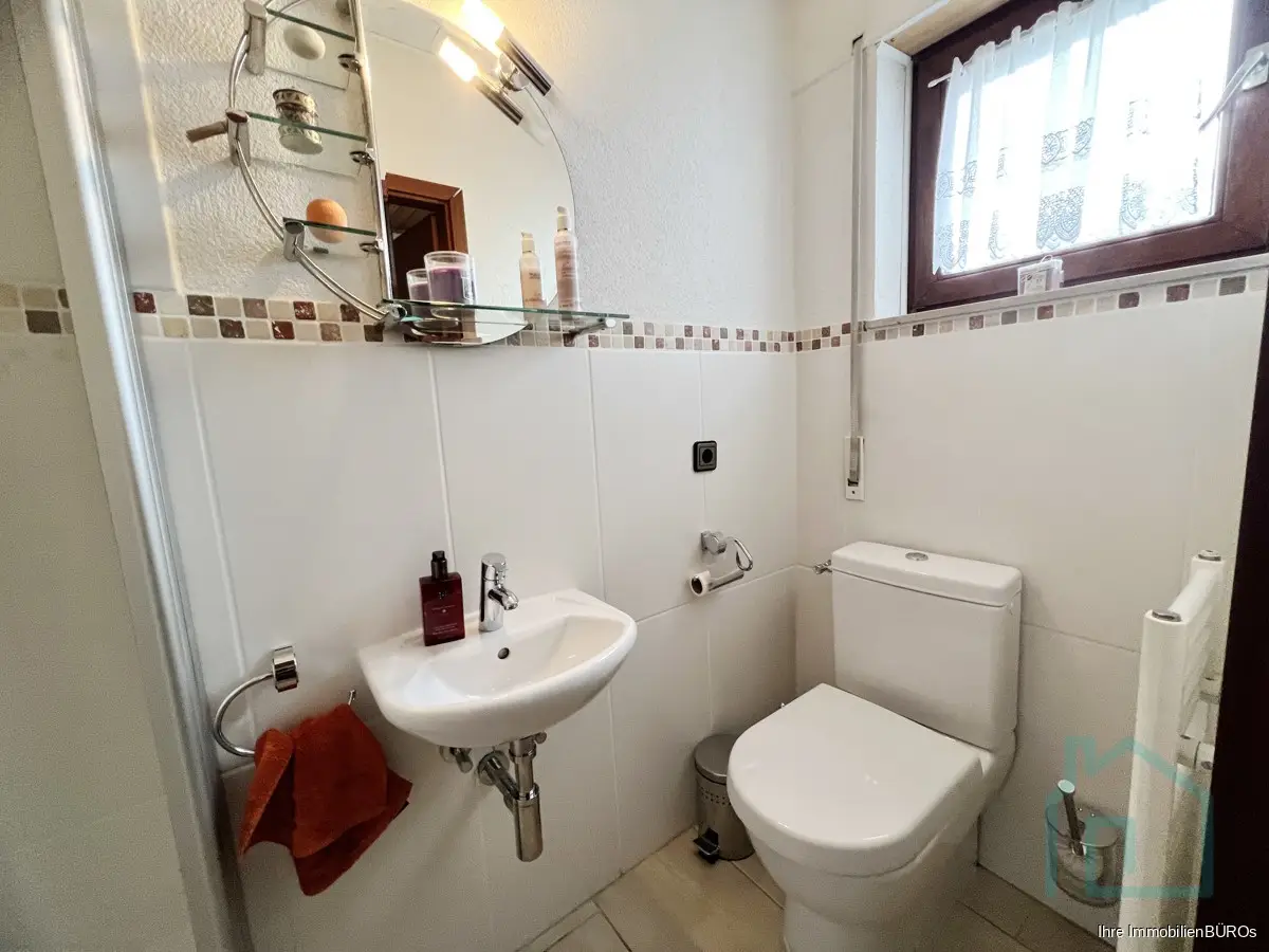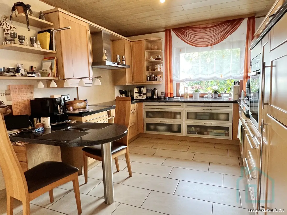 Damals in moderner split-level-Bauweise errichtet, verfügt es über ca. 225 m² Wohnfläche, die sich auf einen großen, offenen Küche-Ess-Bereich mit Kaminofen im Erdgeschoss sowie ein Wohnzimmer und ein Gästezimmer im Souterrain erstrecken. Vom Wohnzimmer geht es in den Wintergarten und den schön angelegten Garten. Im Eingangsbereicht darf ein Gäste-WC natürlich nicht fehlen und das ist sogar mit bodenebener Dusche ausgestattet.