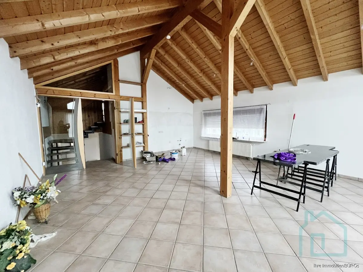 Hier kommen wir in ein großes Studio, aktuell als Wohnbereich mit Küche eingerichtet. Auch von hier geht's nach draußen, auf einen großen Balkon, der Richtung Osten zeigt.