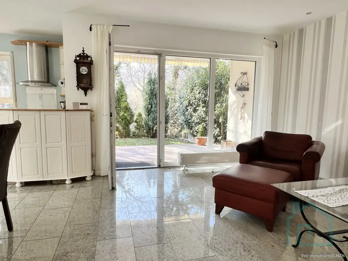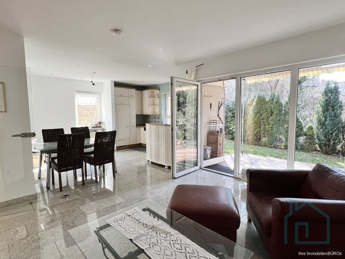 Die lichtdurchflutete Wohnung Ihnen ein einladendes Wohnambiente. Der offene Wohn- und Essbereich ist der perfekte Ort, um entspannte Abende mit Familie und Freunden zu verbringen. Von hier gelangen Sie auf die Terrasse und den schönen Garten, der sich rund um die Wohnung erstreckt.