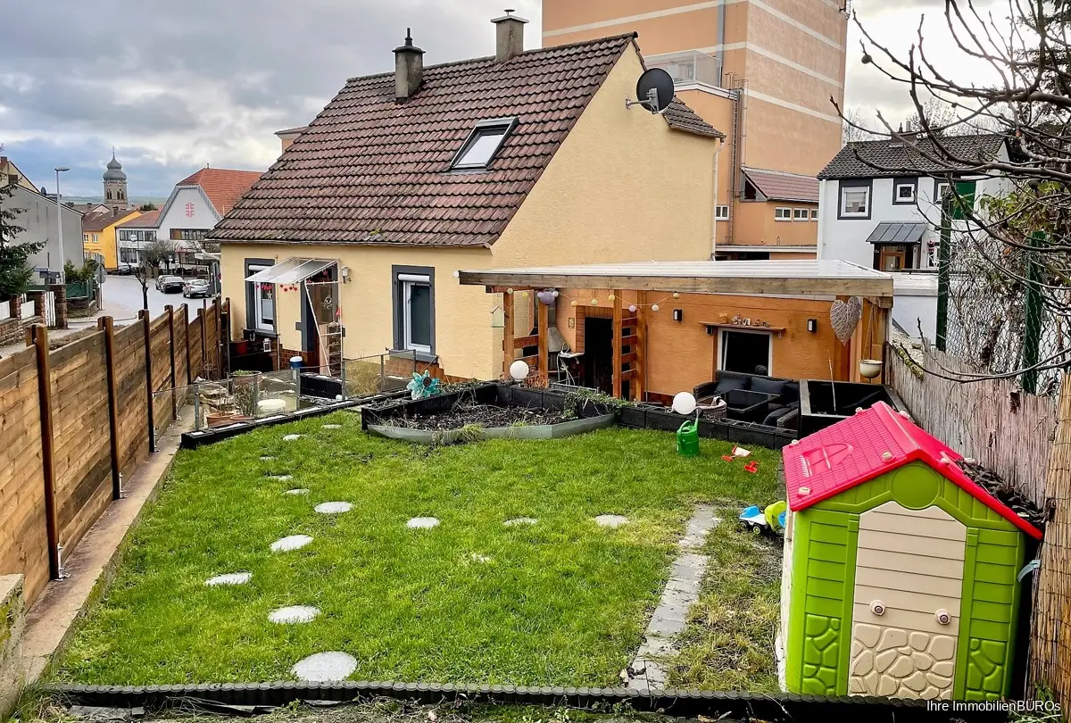 Der kleine Garten mit überdachter Terrasse und Gartenteich lädt zum Verweilen, Spielen und Feiern ein.
