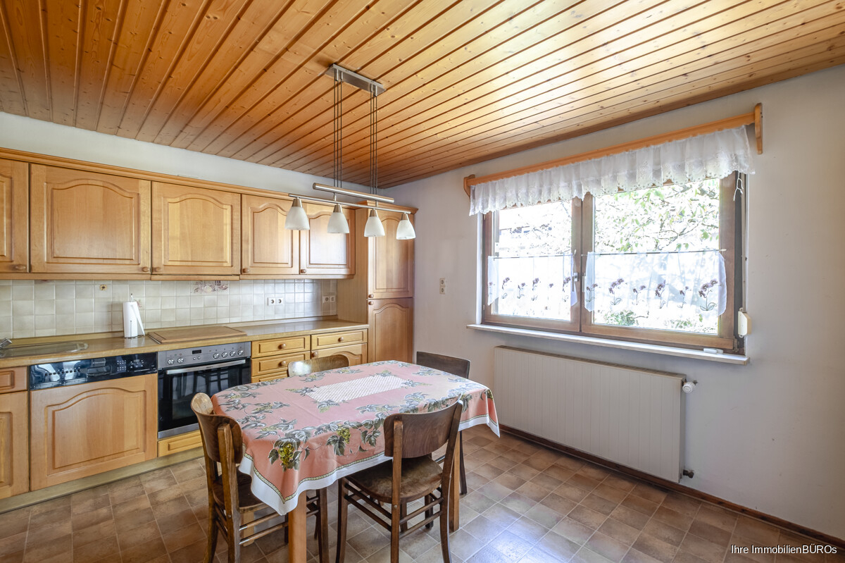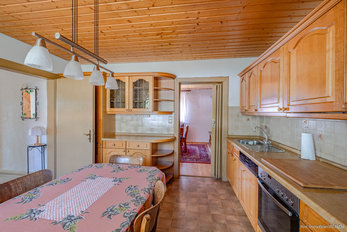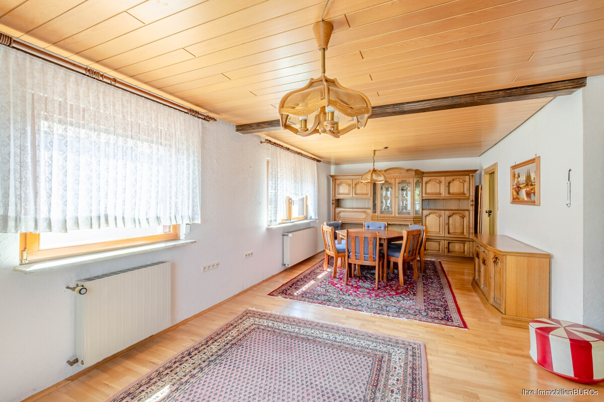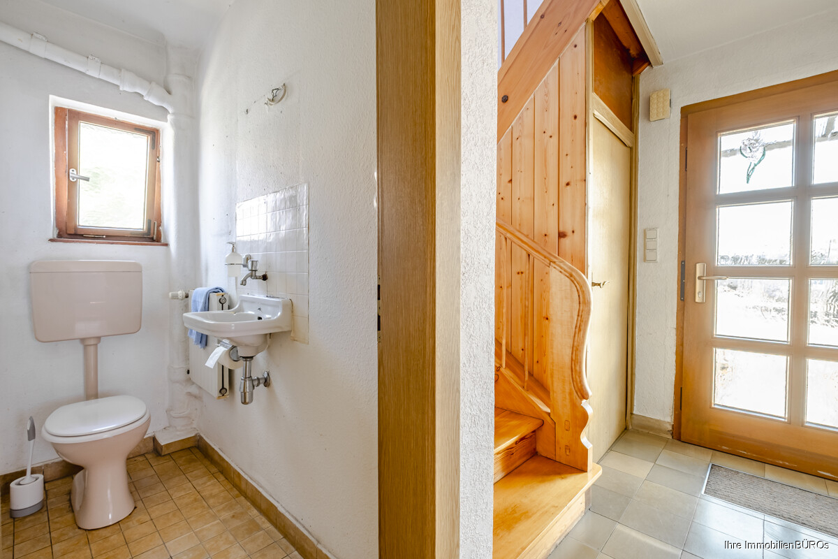 Im Erdgeschoss führt der Flur in ein großzügiges Wohn- und Esszimmer, das durch seine Größe vielfältige Nutzungsmöglichkeiten bietet. Hier lässt sich sowohl ein gemütlicher Wohnbereich als auch ein Essplatz für die Familie einrichten. Ebenfalls auf dieser Ebene befindet sich eine geräumige Wohnküche, die ausreichend Platz für einen Essplatz bietet und damit zum zentralen Treffpunkt im Alltag werden kann. Direkt angrenzend liegt eine kleine Vorratskammer, die zusätzlichen Stauraum für Lebensmittel oder Küchenutensilien schafft. Ein Gäste-WC ergänzt den Grundriss des Erdgeschosses.