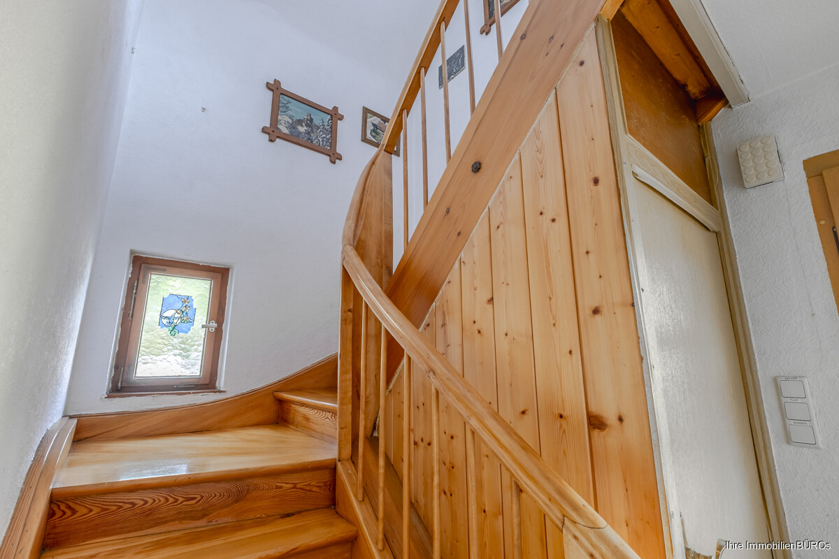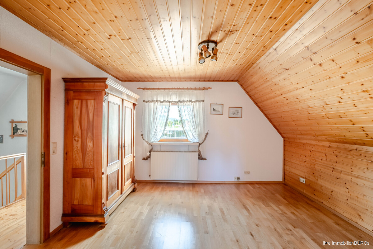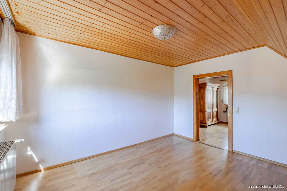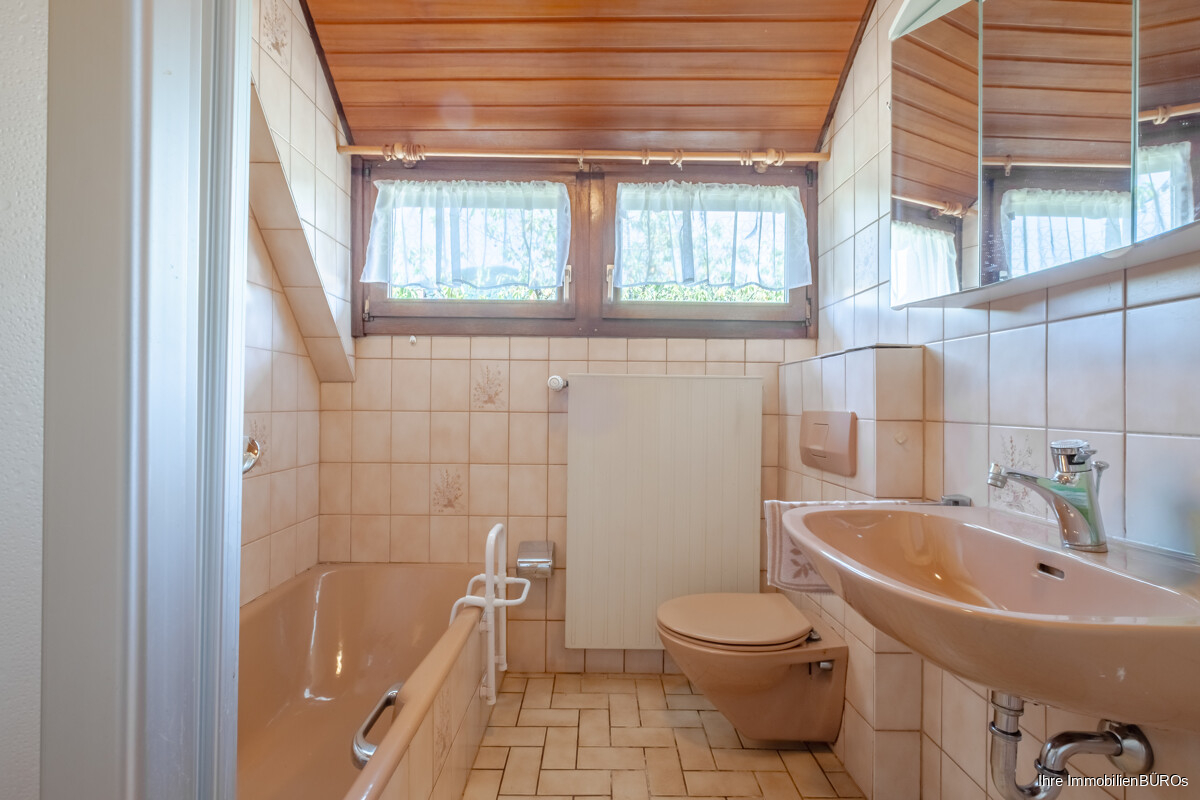 Das Obergeschoss umfasst drei Schlafzimmer, von denen eines als Durchgangszimmer angelegt ist. Diese Raumaufteilung eröffnet flexible Nutzungsmöglichkeiten, beispielsweise als Arbeitszimmer, Kinderzimmer oder Ankleide. Das Tageslichtbad ist mit einer Badewanne ausgestattet. Die Etagen sind durch eine schöne Holztreppe miteinander verbunden, die den ursprünglichen Charme des Hauses unterstreicht.