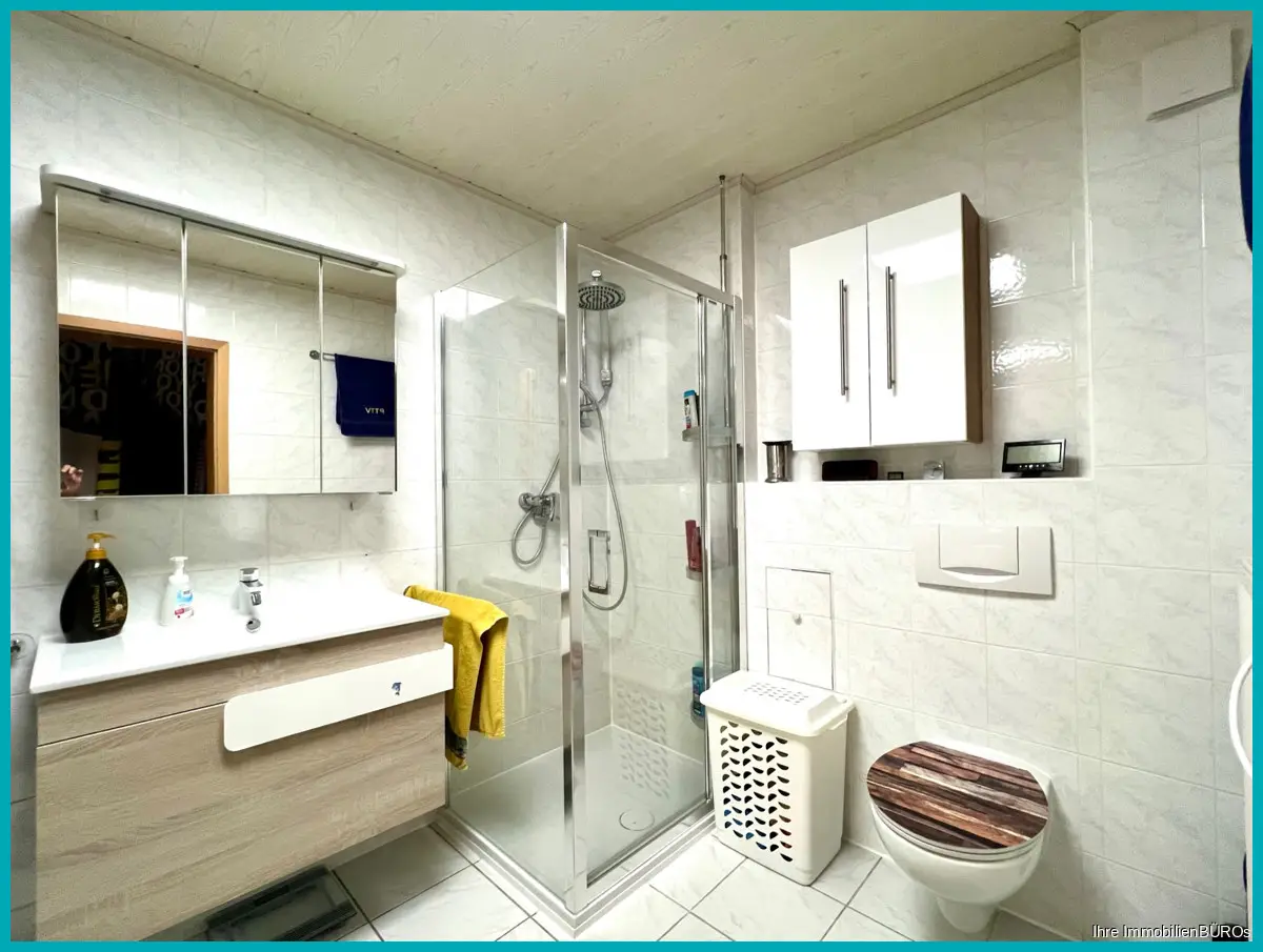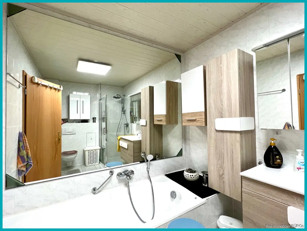 Ein Badezimmer mit Badewanne, bodengleicher Dusche und WC vervollständigen die Wohnung.