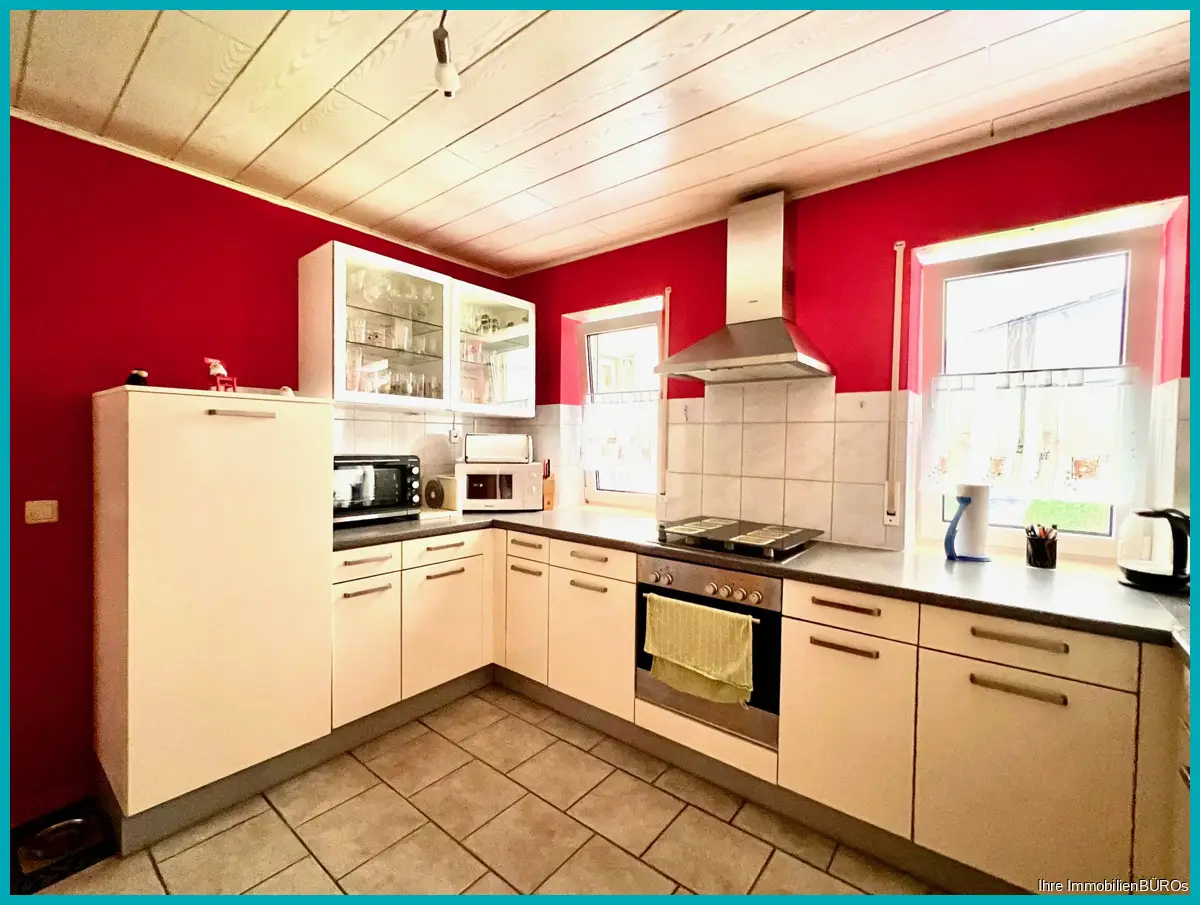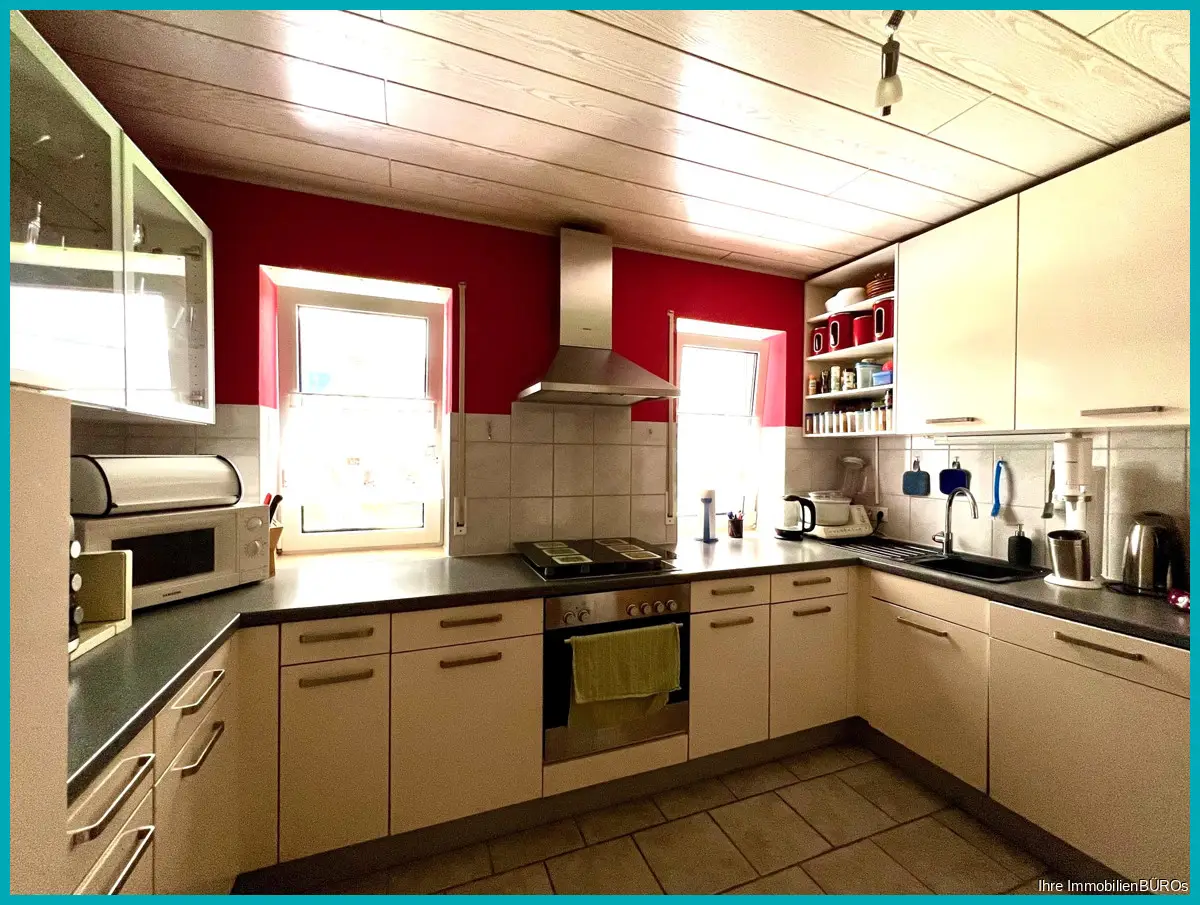 Die gepflegte Einbauküche, die Sie sowohl vom Flur als auch vom Wohn- und Esszimmer betreten können, ist im Kaufpreis mit inbegriffen.