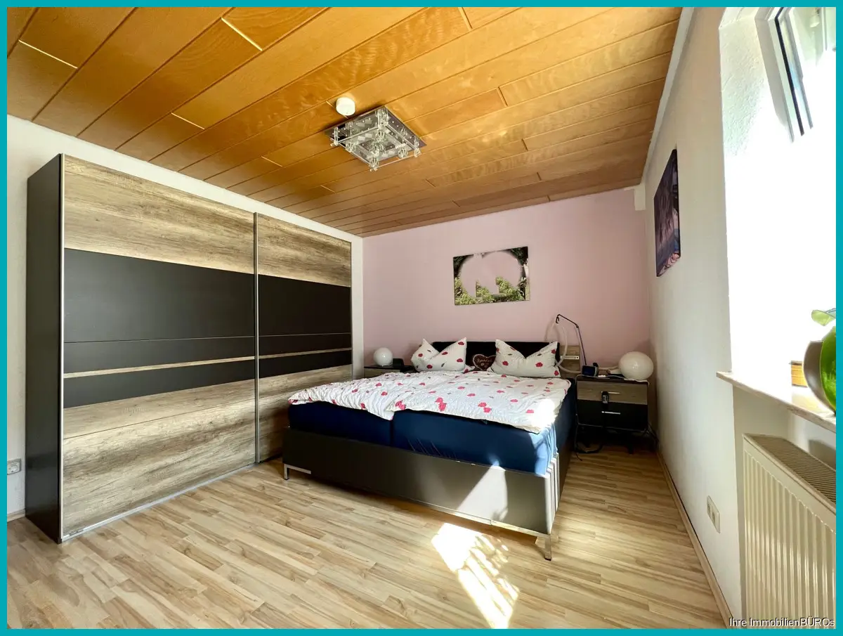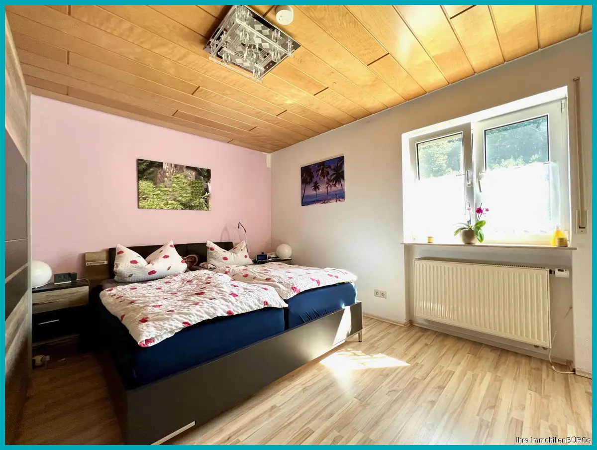 Weiter geradeaus betreten Sie das Elternschlafzimmer mit Zugang zur Terrasse und Blick ins Grüne.