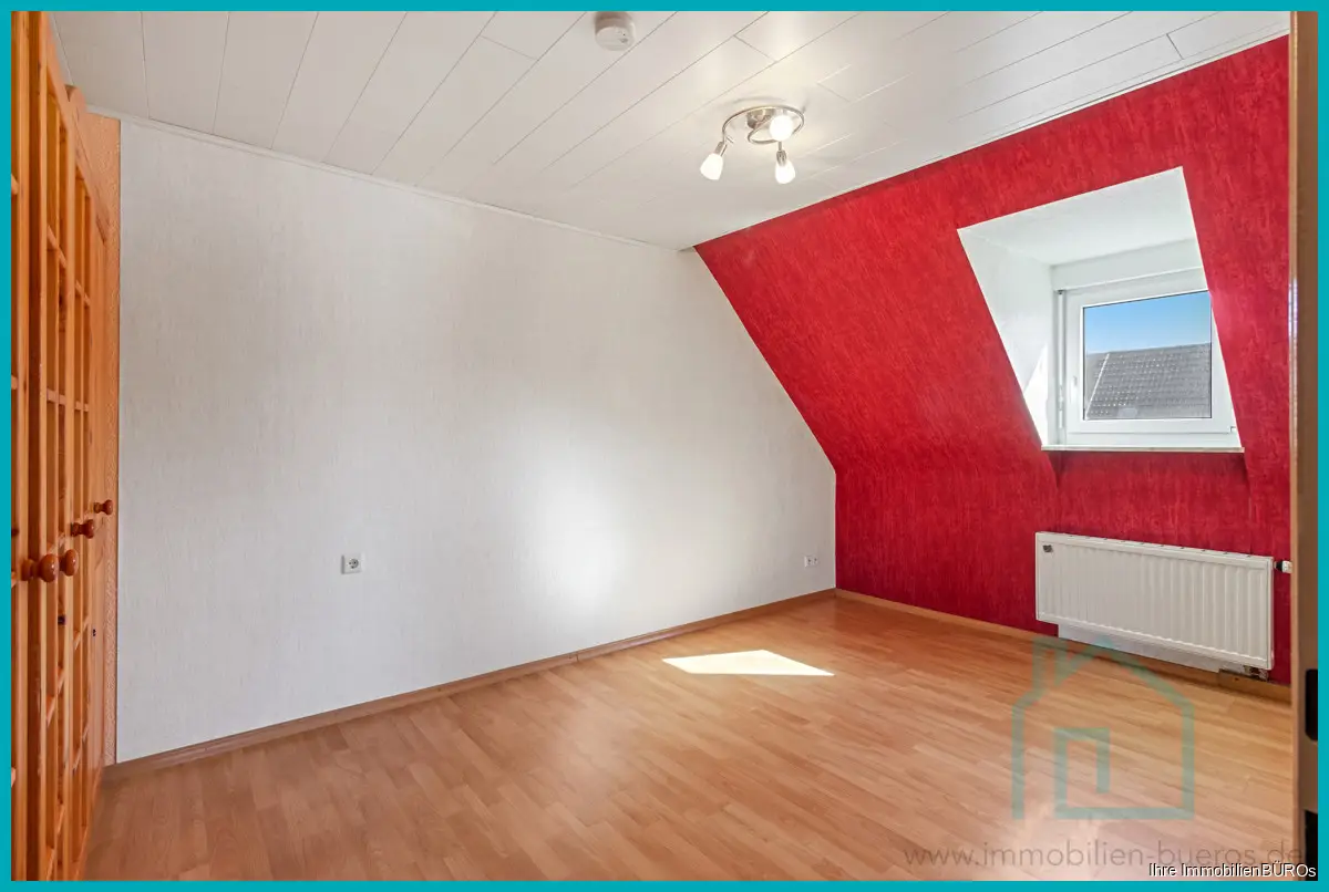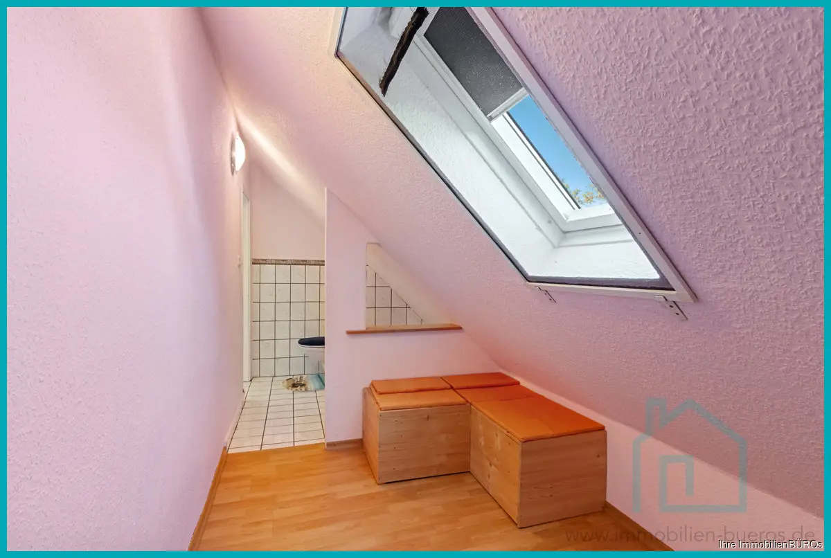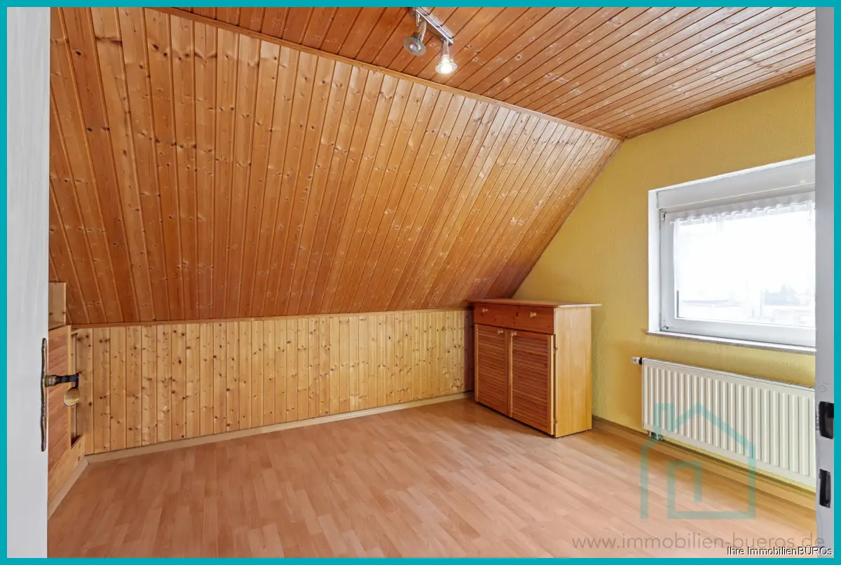 Die zweite Wohnung erstreckt sich über das Ober- und das Dachgeschoss, zusammen ca. 76 m² Wohnfläche, verteilt auf 3-4 Zimmer, Küche und Bad.