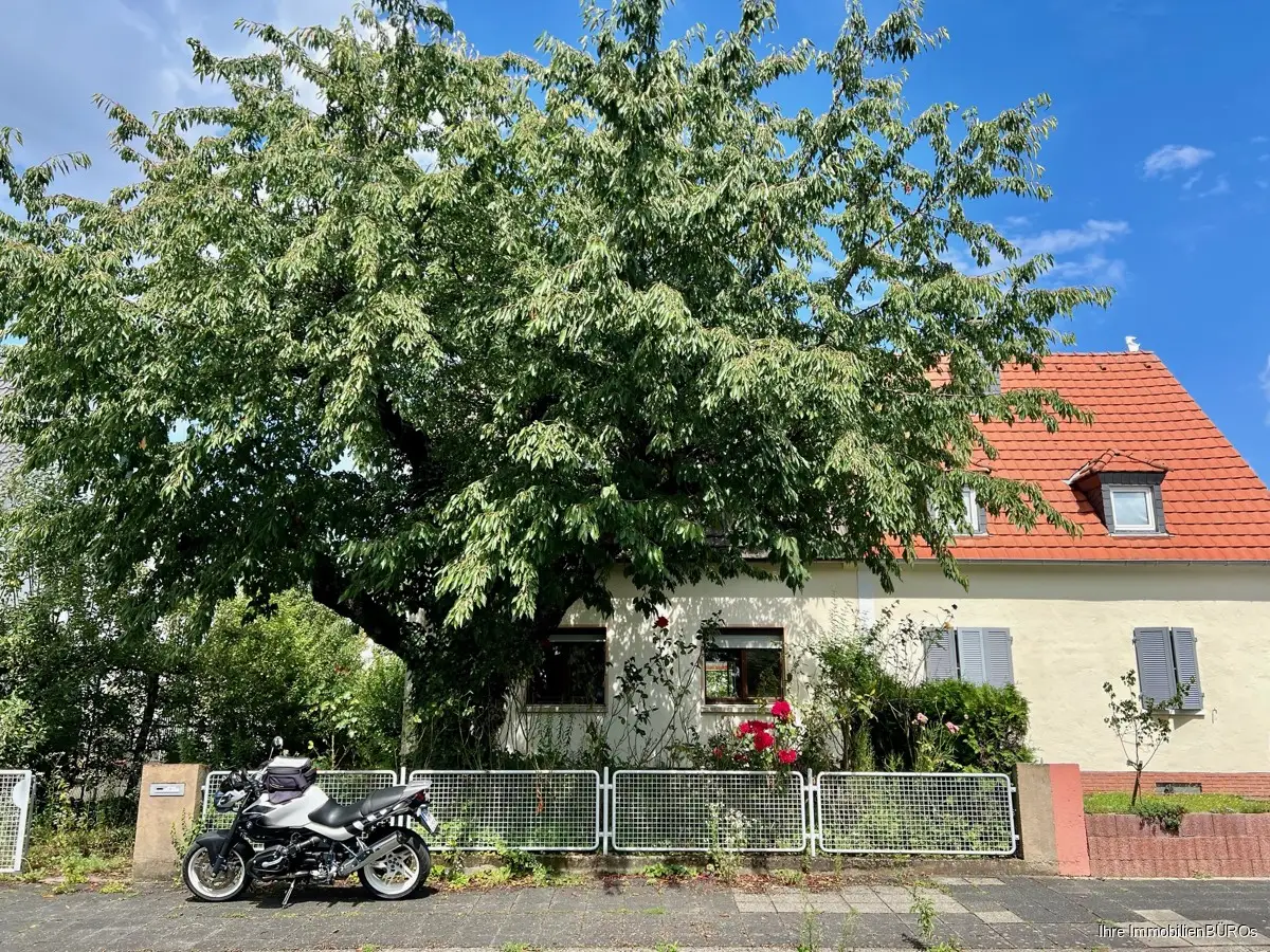 Im Vorgarten steht ein großer Kirschbaum.
