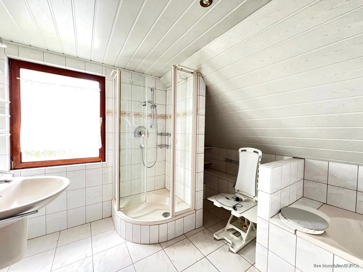 Das im Design zeitlose Badezimmer im 1. Obergeschoss ist mit einer Badewanne, Dusche und einem WC ausgestattet.