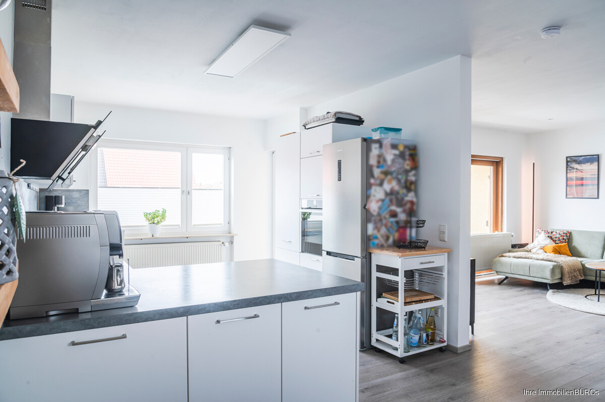 Die Maisonette erstreckt sich über das Ober- und Dachgeschoss eines gepflegten Wohnhauses und bietet insgesamt fünf Zimmer. Mittelpunkt der Wohnung ist der großzügige Wohn- und Essbereich mit offener Küche – ein idealer Ort zum Wohlfühlen, Kochen und geselligen Beisammensein. Von hier aus gelangt man auf den sonnigen Balkon.