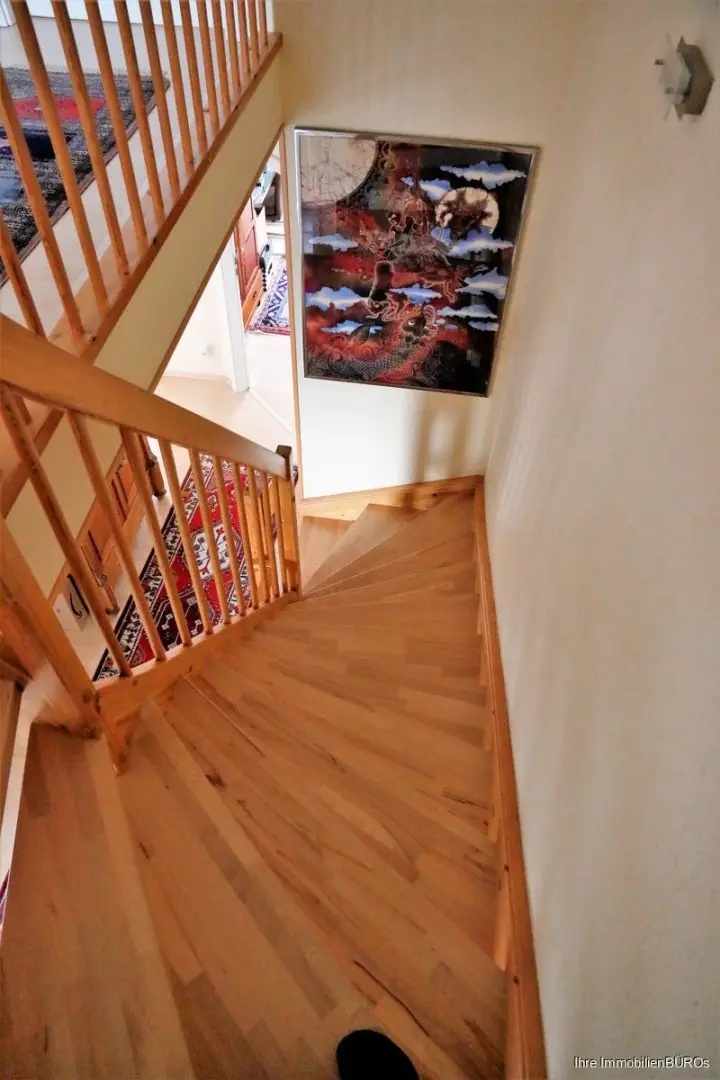 Zurück im Haus gelangen Sie über eine schöne Holztreppe in das Obergeschoss.