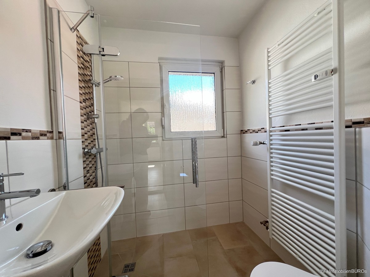 Badezimmer mit bodengleicher Dusche und WC.