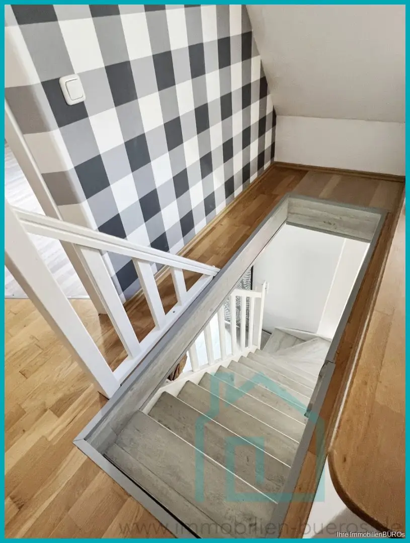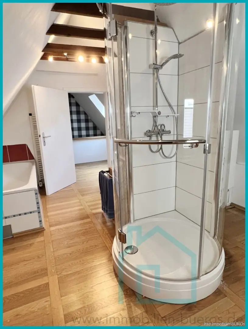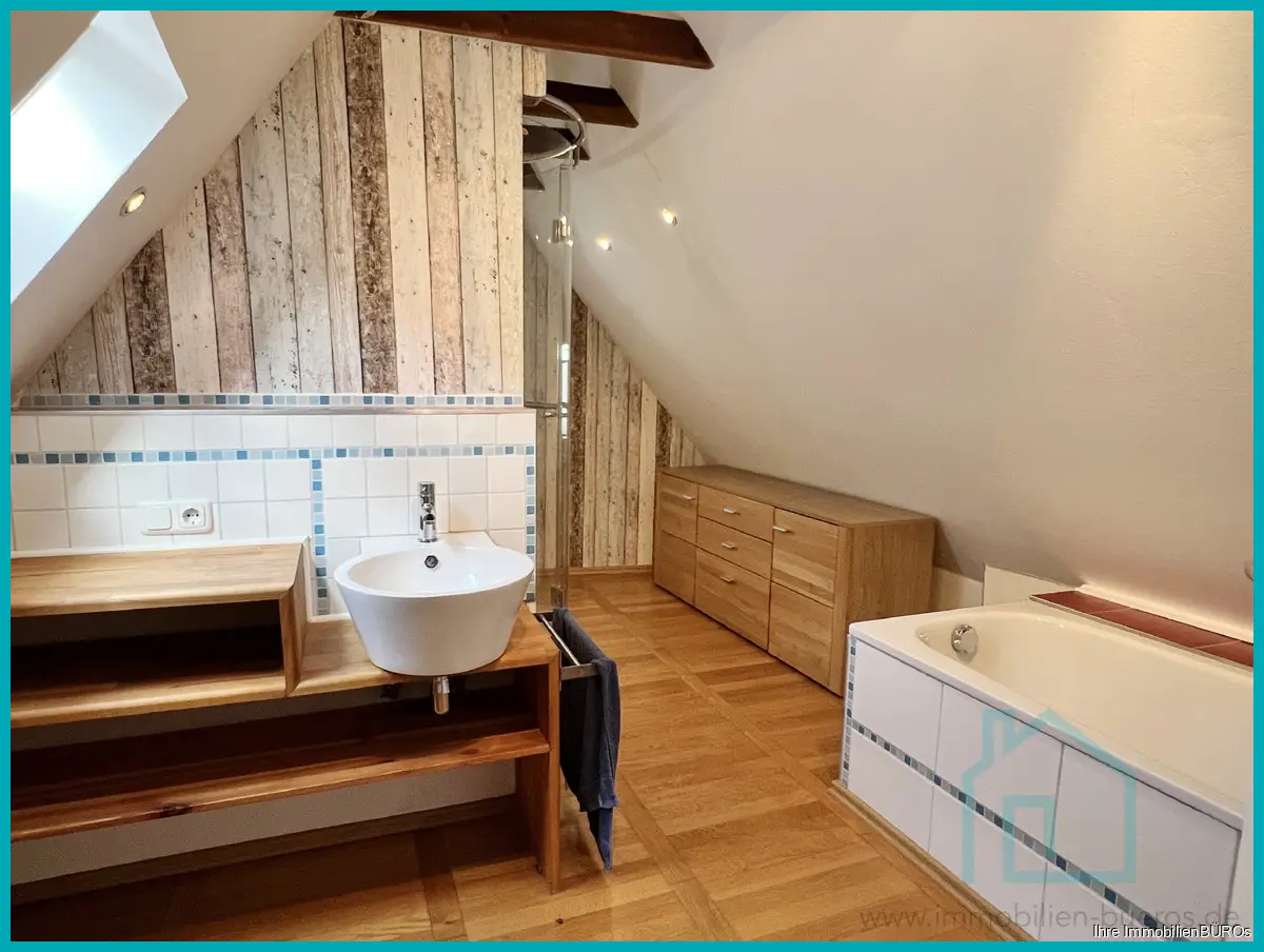 Im Obergeschoss befindet sich das Badzimmer mit Dusche und Badewanne. Hier ist auch die Gasheizung der Immobilie untergebracht. Ein Schlafzimmer mit angrenzendem begehbaren Kleiderschrank ist ebenfalls in der oberen Etage.