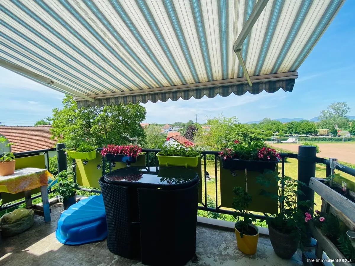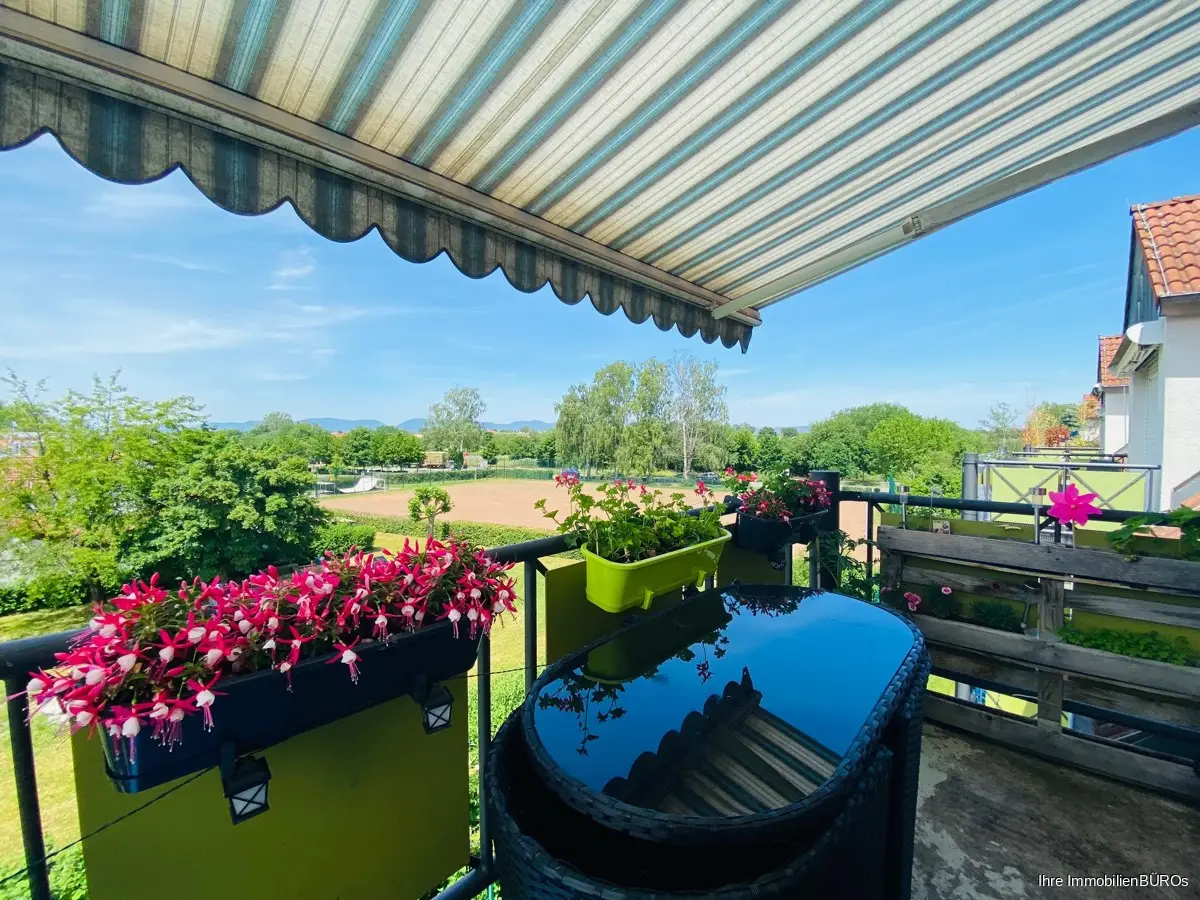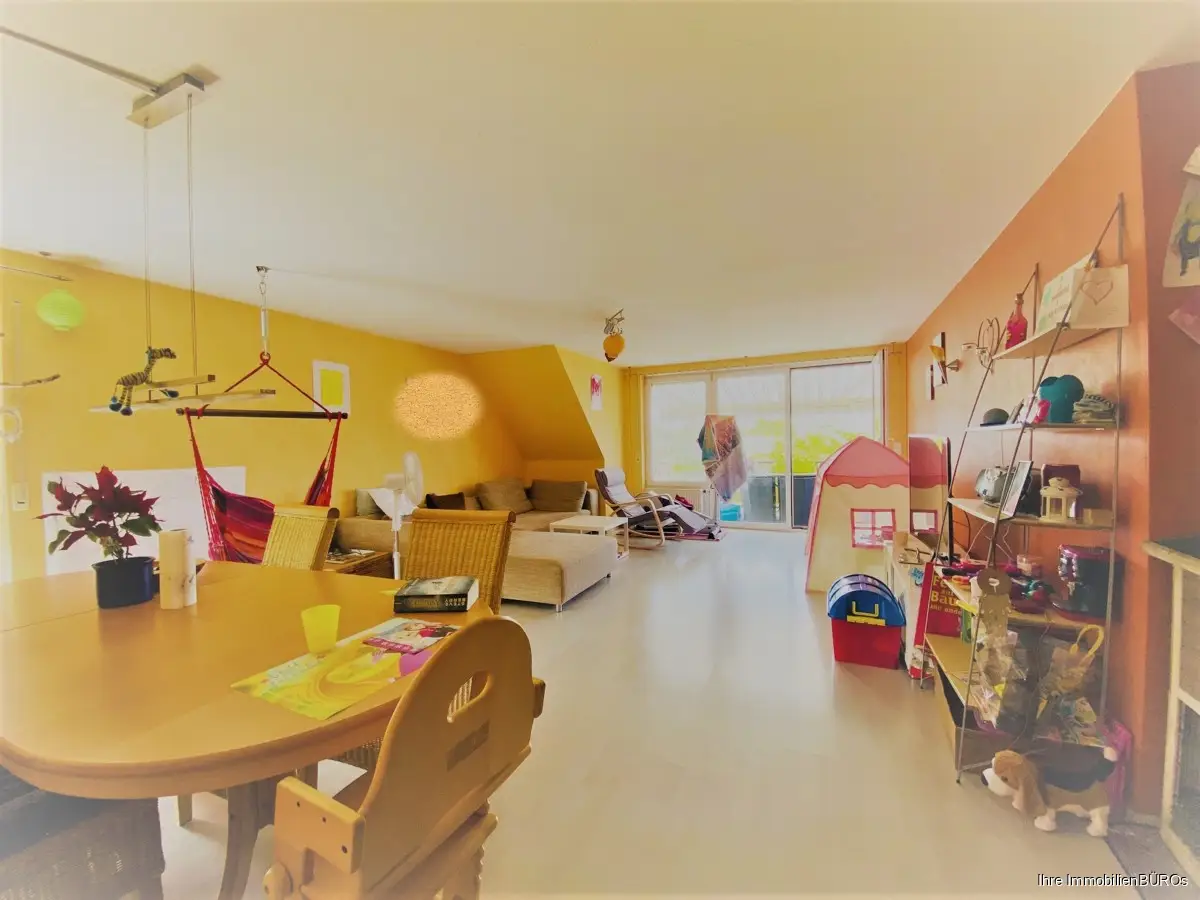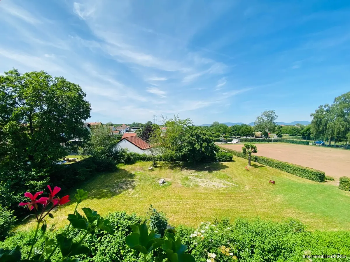 Weiter geradeaus betreten Sie das große und lichtdurchflutete Wohn- und Esszimmer mit einem Balkon (Westen) und Blick ins Grüne.